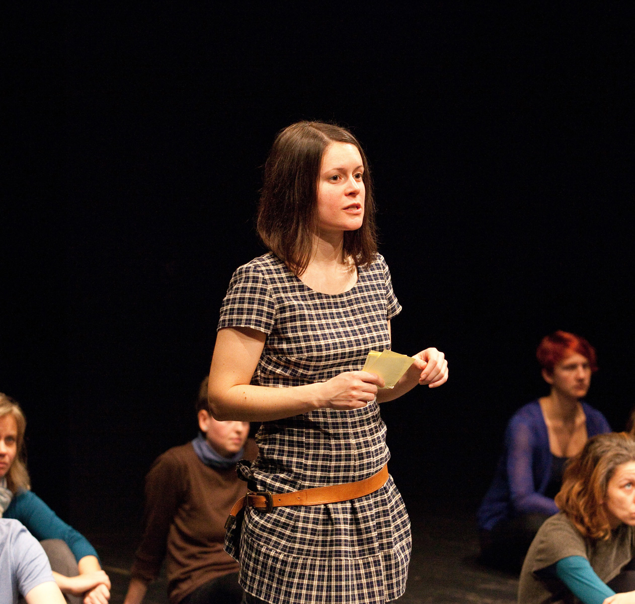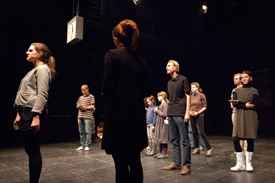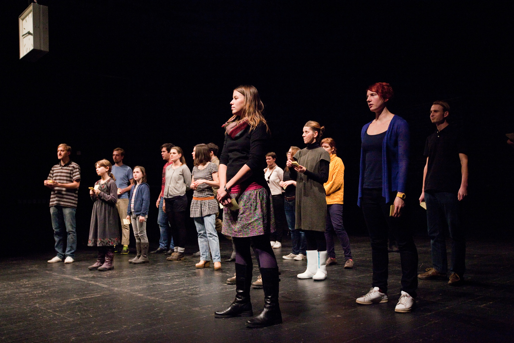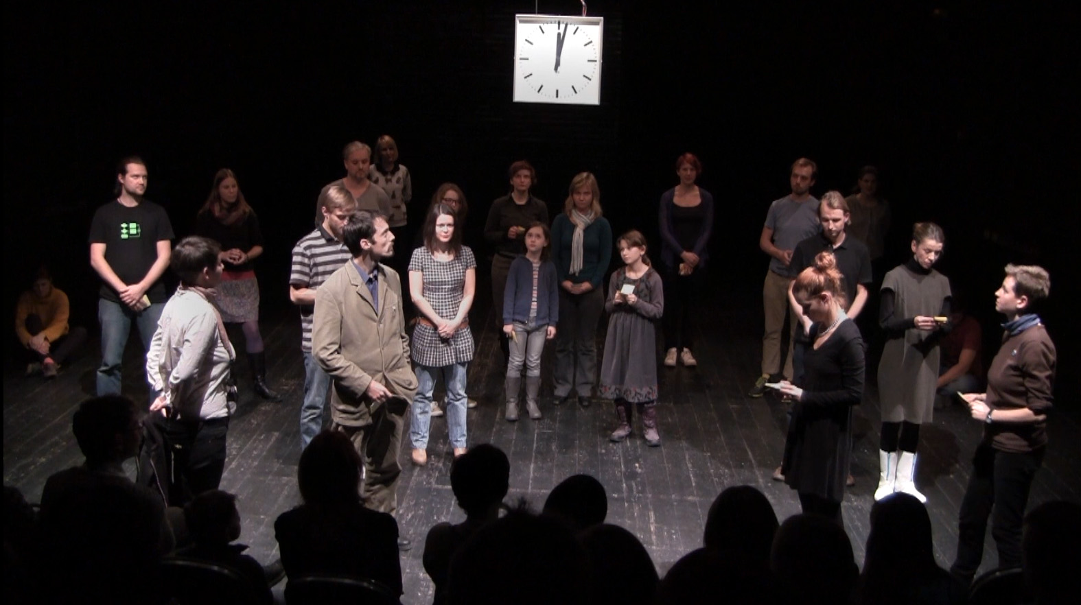22 participants recite on stage sequences of their previously recorded activity-logs. The centrally mounted clock runs through the 24 hours of a day in just 40 minutes. This clock provides the tact for the presentation of the textparts, which are spoken in accordance with the manipulated time.